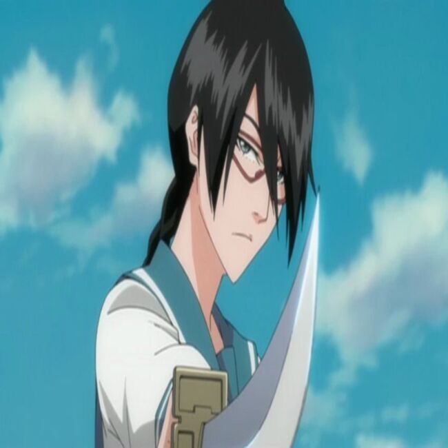 This is a photo of Yadōmaru Lisa, a fictional character, who is a girl with glasses and long black hair braided with a seifuku style outfit from the manga Bleach. Lisa's appearance is that of a young woman with emerald green eyes, red oval glasses, and long black hair. Her hair has bangs in the front and she wears it back in a braided ponytail.